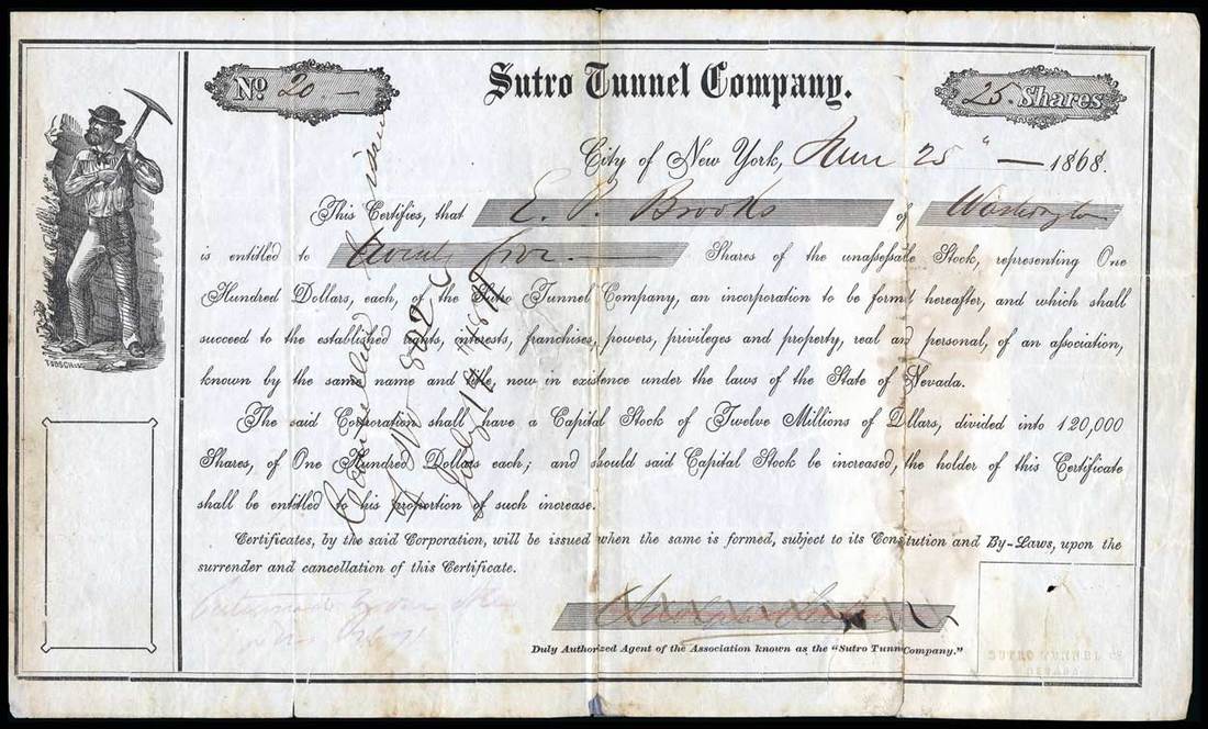 Sutro Tunnel Company (New York) 1868. City of New York. 25 shares. No.20. Prospector swings pick, left. Signed by Adoph Sutro as "Duly Authorized Agent." Issued, cancelled. There is a fold split backed with paper, age toning, and a small piece out at the bottom, otherwise Fine. In 1860, miners of the Comstock Lode encountering serious flooding and ventilation problems as they worked in ever increasing depths. Adolph Sutro envisioned a six-mile long drainage tunnel in order to solve the problem. In 1865 the Nevada legislature granted the company an exclusive franchise and a year later the U.S. Congress followed with another charter. The sale of stock in the U. S. allowed construction to begin in 1869, one year before this certificate was issued, but to complete the project, further funding was obtained from England through the banking house of McCalmont Brothers and Company. When the Tunnel was finished, Sutro sold his shares and moved to San Francisco where he quickly gained prominence as one of the leading citizens.