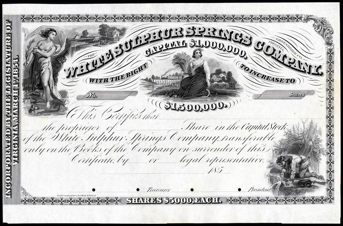 White Sulphur Springs Company (Virginia) 185_. Greenbrier County. Capital Stock. Proof on India paper. Ceres, train beyond. Semi-nude allegorical female (Morning), left. Frontiersman, right. Wonderful engraving and printing by Bald, Cousland & Co., New York. Extremely Fine. Very few Proof stock certificates of any kind have survived from this time period and printer.