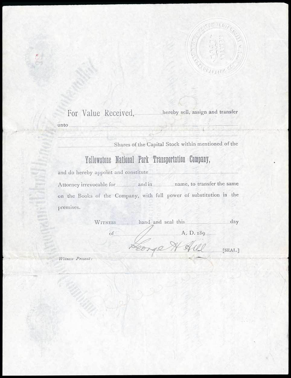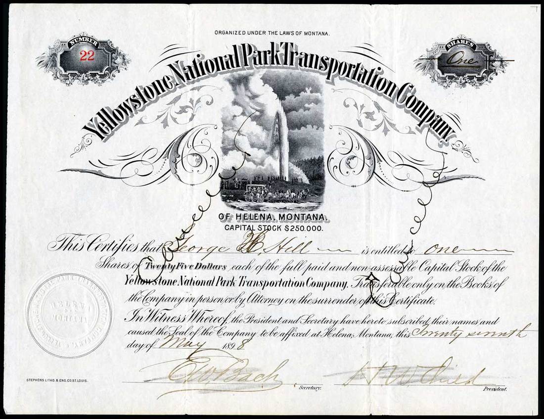 Yellowstone National Park Transportation Company (DE) 1898. Office at Helena, Montana. No.22. One share. Close up view of "Old Faithful," the famous geyser. Issued to the George H. Hill, and signed by H. W. Child as president. Issued, cancelled. Very Fine+. Fully issued examples of this title are quite scarce.