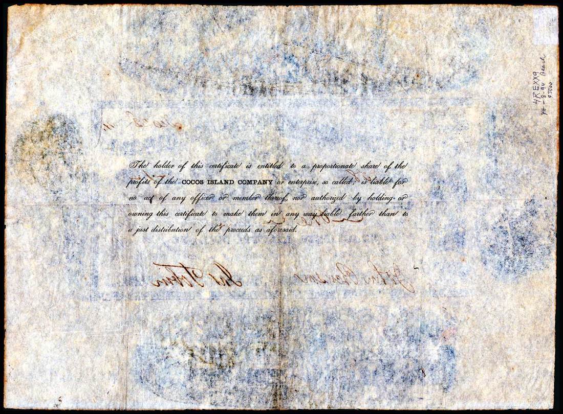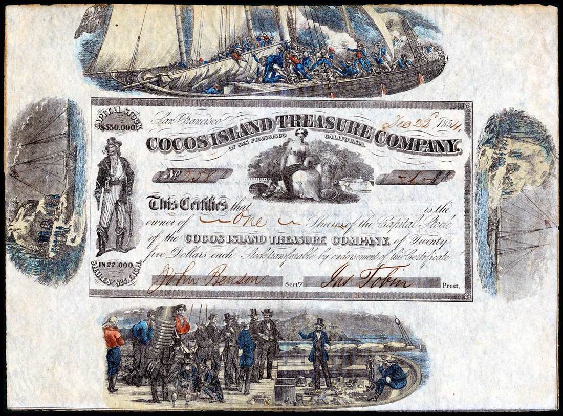 Cocos Island Treasure Company (California) 1854. San Francisco. One share. No.258. Buccaneer, left. Ceres with wheat, center. Overall dimensions 8" x 11." The central 4" x 8" certificate is surrounded by four handsome hand-colored images of sailing ships and pirate battles. Fully prepared, with the date, serial number, number of shares, and officer's signatures. The owner's name is not filled in. Uncancelled. Very Fine+. Throughout history the promise of finding buried pirate treasure has induced investors to participate in capitalizing treasure hunting companies. Cocos Island has been the focus of much of this treasure hunting activity. One estimate places the number of Cocos Islands treasure hunting expeditions at over three hundred, though no major find has ever been publicly reported. Companies resorted to the use of visually appealing stock certificates to convince investors to participate, and the rarest and most spectacular of these certificates is surely the Cocos Island Treasure Company. This certificate first appeared in an R. M. Smythe Auction in the early 1980s. According to the consignor, it was owned by the late Paul Richards, Scott Winslow, a prominent Maryland collector, and David Beach. It is now being offered publicly for the first time in almost thirty years.