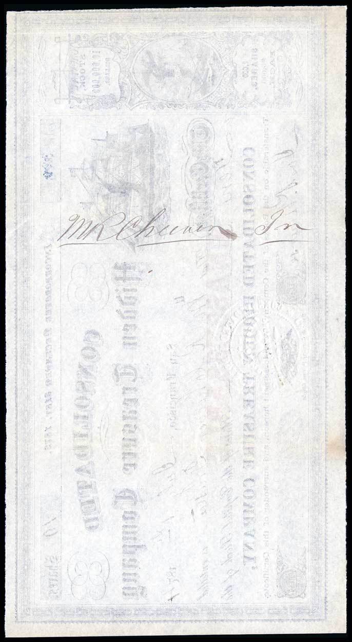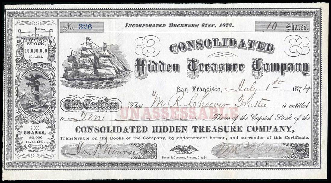 Consolidated Hidden Treasure Company (CA) 1874. San Francisco. 10 shares. No.326. Red underprint. Sailing ship. Eagle below. Bacon & Company, printers. Almost New. According to our consignor, only three were discovered.