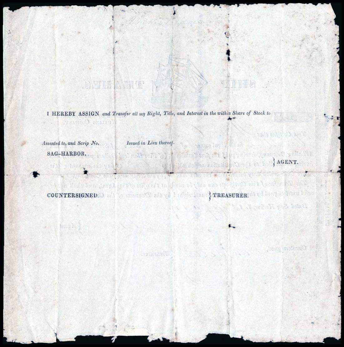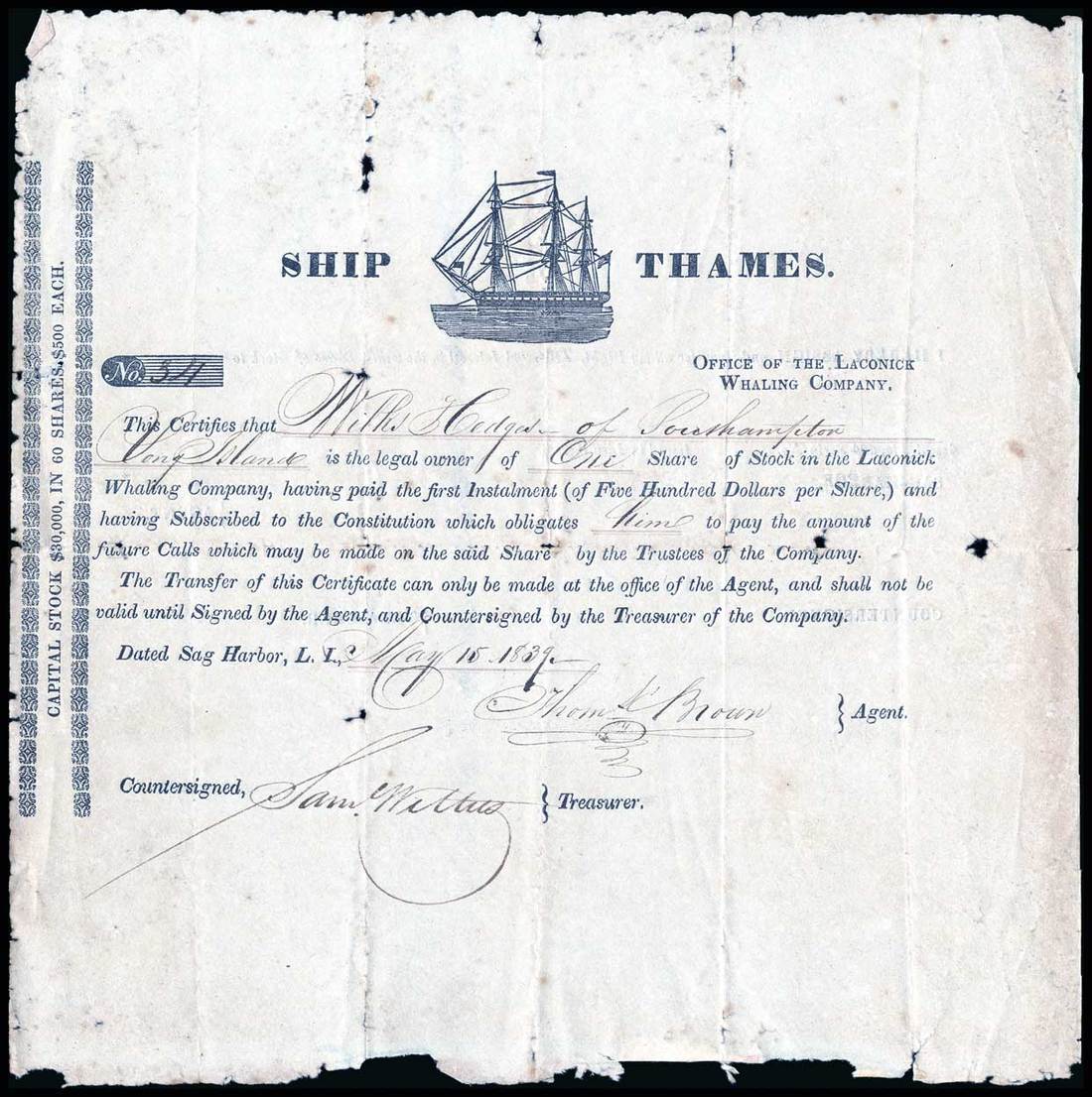 Lackonick Whaling Company - Ship Thames (New York) 1839. Sag Harbor. One share, $500 per share. No.34. Part printed form. Three-masted ship, Thames, at the top. Rough edges. Issued, not cancelled. Fold junction holes, otherwise Very Fine. This is the only whaling certificate in the collection with a vignette.
