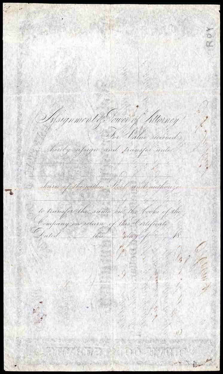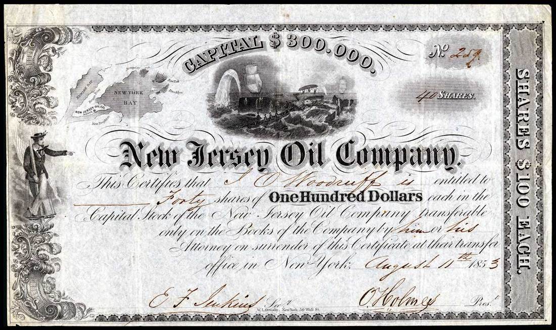 New Jersey Oil Company (New York) 1853. 40 shares. No.259. Whale hunting on the high seas. A whale boat tossed into the sky by an angry leviathan can be seen in the distance. Sailor and map of New York Bay indicating the location of the New Jersey Oil Company "works." W. L. Ormsby, printer. Issued, uncancelled. Pinhole, otherwise Very Fine. In the 1850s, before the petroleum industry began, whale oil was widely in use for illuminating and lubricating purposes, but the whale oil had to be refined before it could be utilized. W. L. Ormsby, the printer and engraver of this certificate, also printed bank notes, and his work is widely collected.