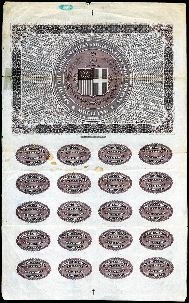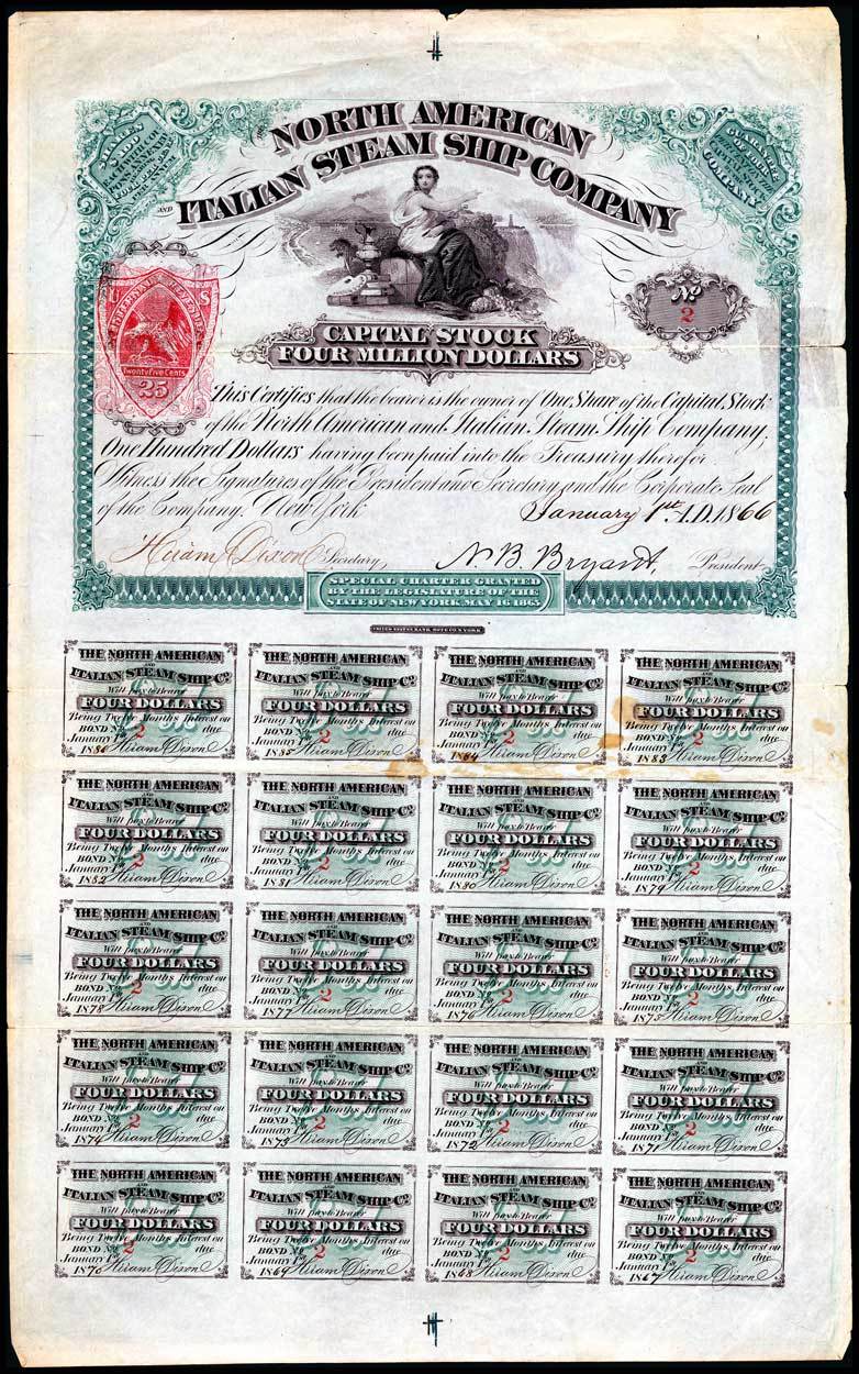 North American Italian Steam Ship Company (New York) 1866. One share. Green. Woman seated on cotton, Niagara Falls and Mount Vesuvius in the background. RN-T3 25 Cent red imprinted revenue stamp. Brown verso. 20 coupons below. Very Fine, minor stains and a small taped fold split. Included prospectus mentions the establishment of a steamship line between New York and Genoa. Not in Castenholz. Ex R. M. Smythe January 19, 2001, Lot 1145.