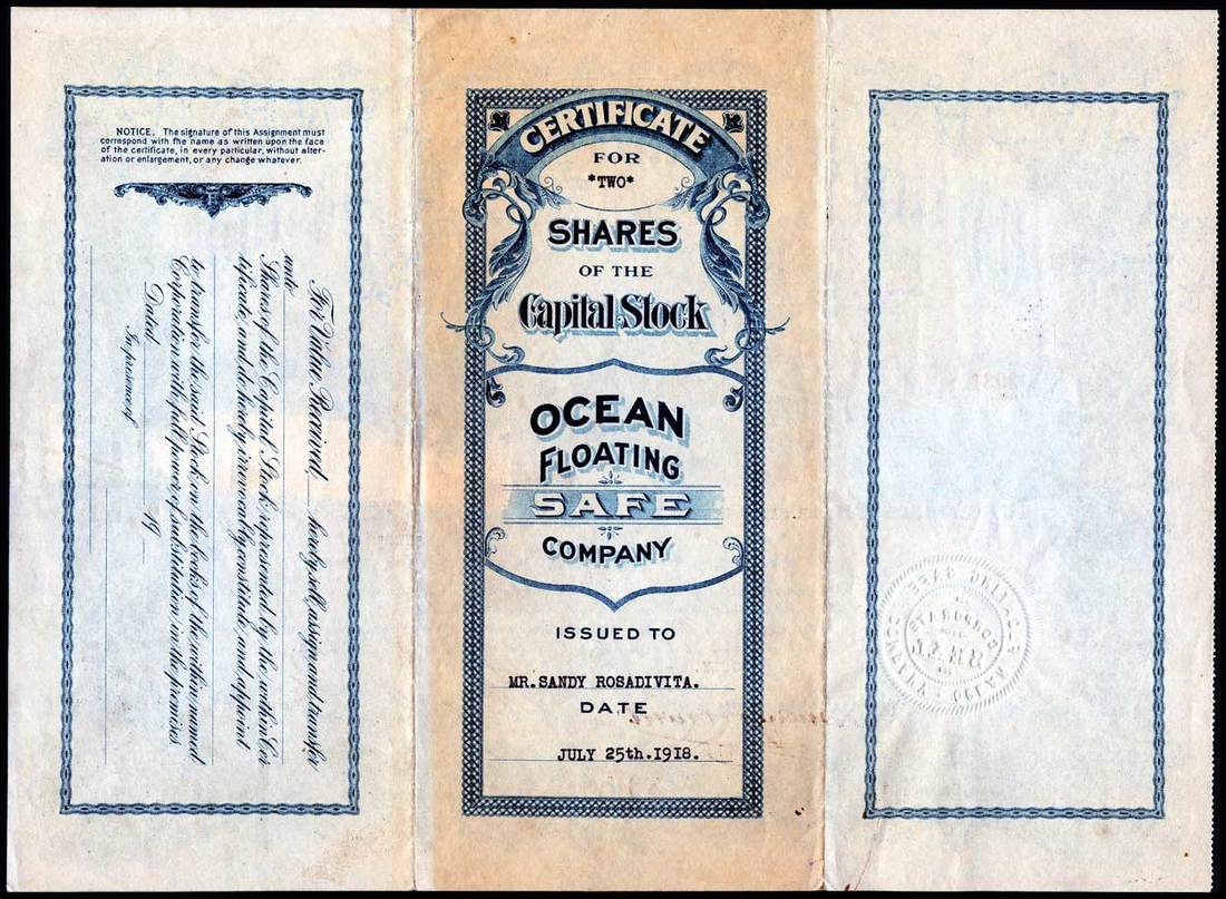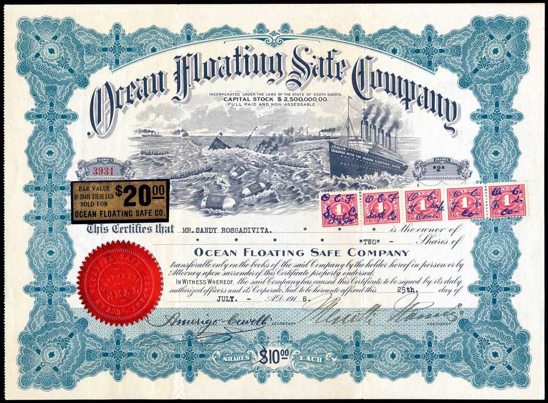 Ocean Floating Safe Company (South Dakota) 1918. 2 shares. No.3931. Green, red embossed seal. Steamship Italia "EQUIPPED THE FLOATING SAFE" cruises by a sinking steamship. Strip of 1 cent tax stamps, and gold and black $20 par value label. VF+.