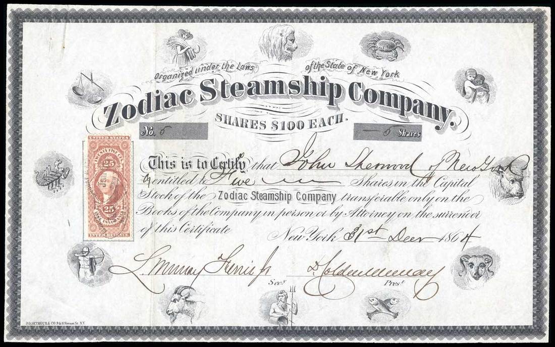 Zodiac Steamship Company (New York) 1864. 5 shares at $100 each. No.5. All of the signs of the Zodiac arranged in an elliptical pattern around the main text elements. 25 Cent R47c Life Insurance stamp affixed. Issued, not cancelled. Narrow margins, otherwise Very Fine+.