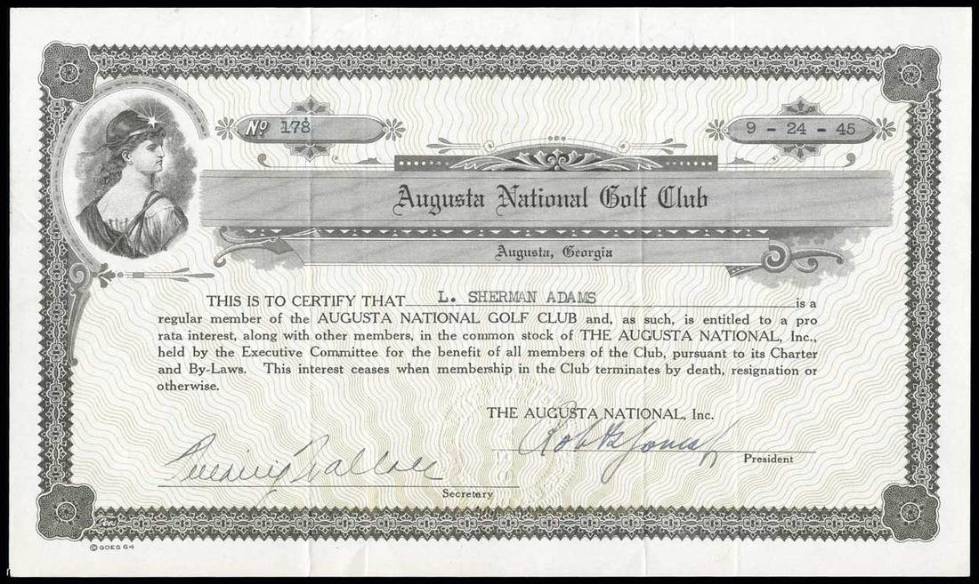 Augusta National Golf Club (Georgia) September 24, 1945. August. "…pro rate interest in the common stock." No.178. Gold under print. Green back. Woman with starred cap. Goes 64. "THE AUGUSTA NATIONAL, Inc." above the right signature block. Issued to L. Sherman Adams and signed by Robert Jones as president. Issued, not cancelled. Very Fine+.
