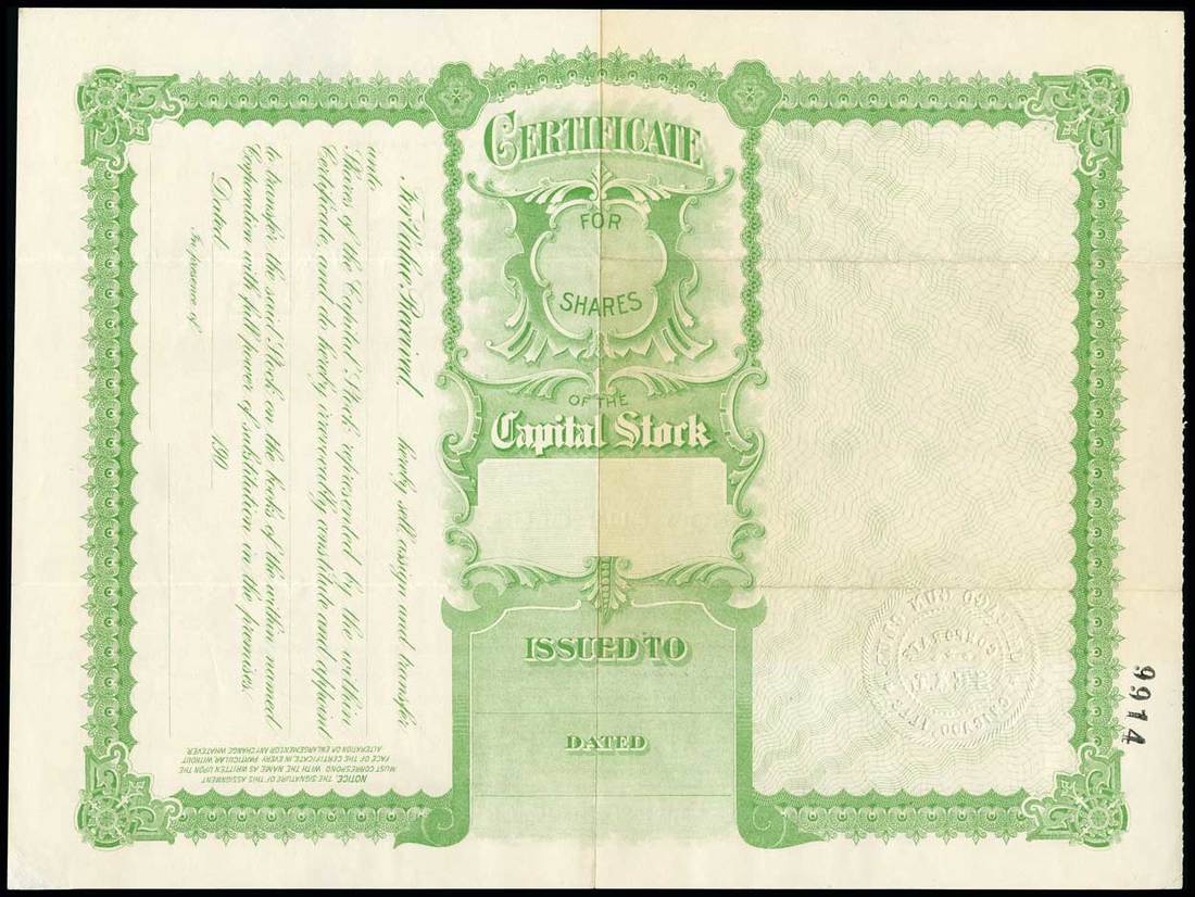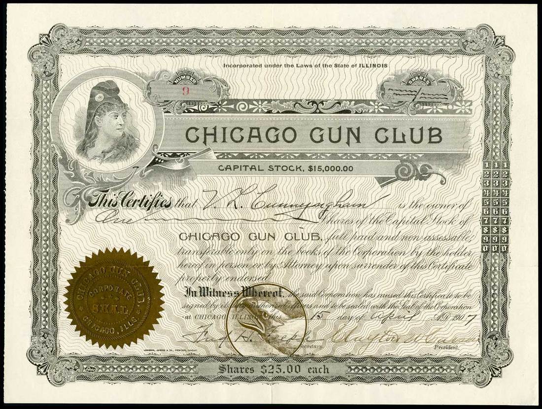 Chicago Gun Club (IL), One share, 1907, #9, woman in circle, eagle below. Not seen before by this cataloger. very fine plus.