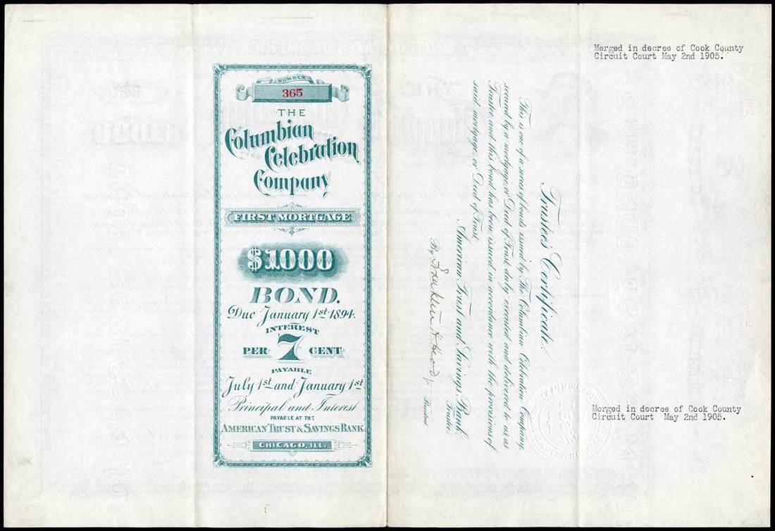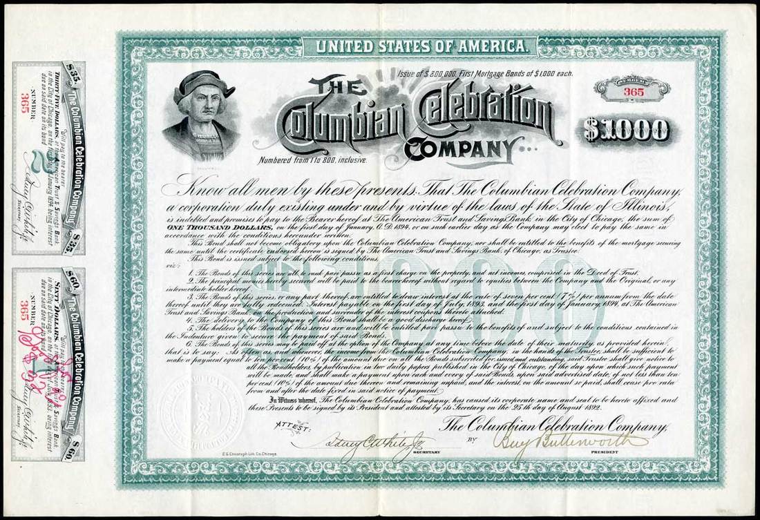 Columbian Celebration Company (IL), First Mortgage $1000 Bond, 1892, #365, green borders and $1000 underprint, Columbus, Signed as president by Benjamin Butterworth, who was formerly Secretary of the World's Fair. The purpose of the company was to stage an elaborate play depicting the story of Columbus and his discovery of the New World. A collosal "Spectatorium" was to be built, two blocks away from the World's Fair, but cost overruns prevented completion, and the company failed. extremely fine