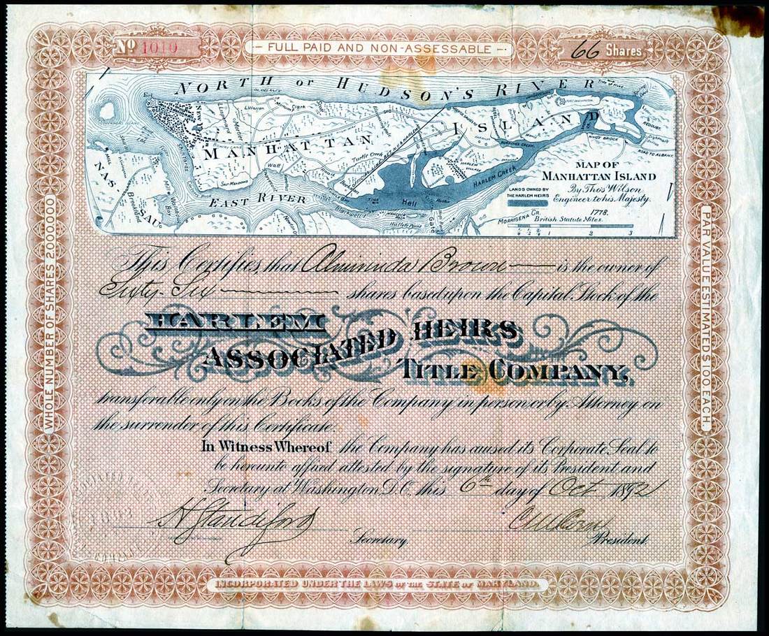 Harlem Associated Heirs Title Company (MD). 1892. 66 shs. No.1010. Red. Illustration of a 1778 British map of Manhattan Island. IU. VF+ details, four short edge splits backed with archival paper. There is a stain in the upper right corner. We know of only one other example.This certificate represents the claim of various heirs for over 1000 acres of land and water in Manhattan from 74th to 128th streets. Based on a land grant given in 1666 (the year the Spink was founded), by English Governor Richard Nichols to five men. Potential heirs would sign over their shares in the property to the company, then pay a fee, with the fees being used to pay the expenses of pursuing the claim in the courts. This certificate would entitle the share holder to a portion of the proceeds. If the claim was successful the value of the land at the time could have been many millions of dollars. A certificate similar to this one was featured on an episode of the PBS television show, History Detectives, which aired on October 2011. Based on the research done by the History Detectives, no court ruling in this particular case was found. However, decisions were found in similar cases brought by other groups of Harlem heirs in which the courts ruled that the heirs´ claims were indeed legitimate. The courts would not enforce them due to the complexities of sorting out the titles and heirs over a period of several hundred years, and due to the possible repercussions this could have had on the stock market during a period of recession. A fascinating piece of financial and judicial history.