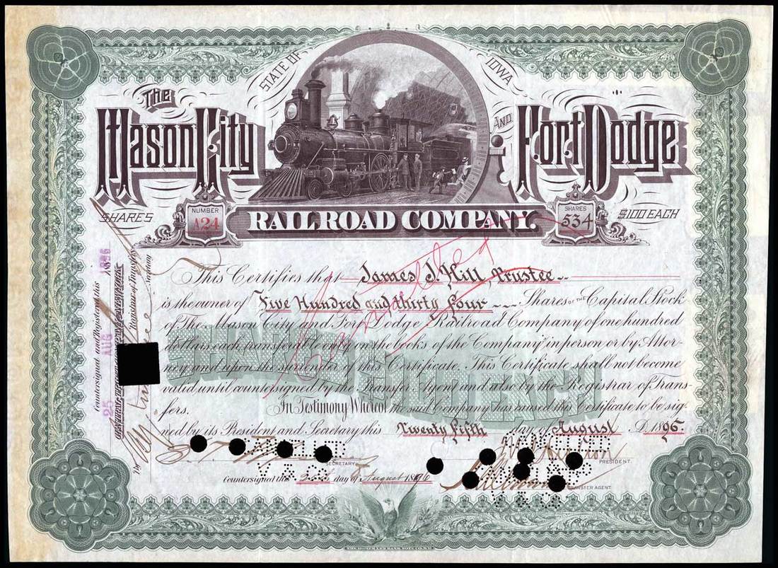 Mason City & Fort Dodge Railroad (Iowa) 1896. 534 shares at $100 each. Fully issued, cancelled. No.A24. Green borders and underprint. Train bursting out of a circular frame. Issued to James J. Hill, Trustee, and signed by him on the verso. The signature lightly pin cancelled and very legible. VF+, with some very minor edge toning at left.