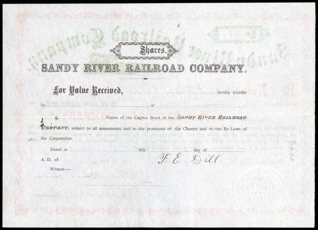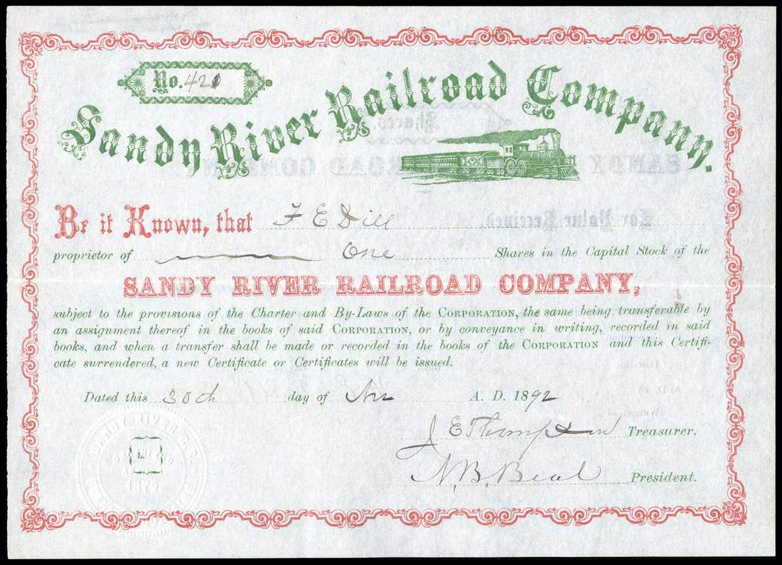 Sandy River Railroad (Maine). 1892. One share. No.421. Red borders, green title and text. Small train faces right. Fully issued, uncancelled. Extremely Fine.