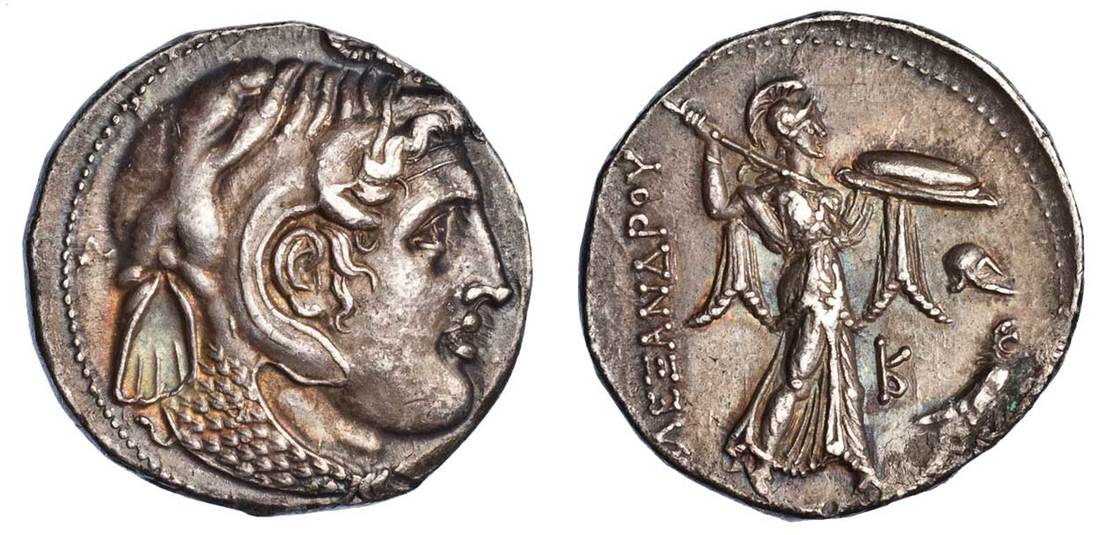 Kings of Egypt. Ptolemy I Soter, as Satrap (323-305 BC). AR Tetradrachm, struck ca. 311/0-305 BC. Alexandria. 15.43 gms. Ptolemaic standard. In the name of Alexander the Great of Macedon. Head of the deified Alexander right wearing elephant’s skin headdress, rev. AΛEΞANΔPoY, Athena Alkidemos advancing right, Corinthian helmet and eagle before, Ko monogram inner right. Svoronos 164, SNG Lockett 3393. Attractive old toning, soft iridescent highlights. Near Extremely Fine.