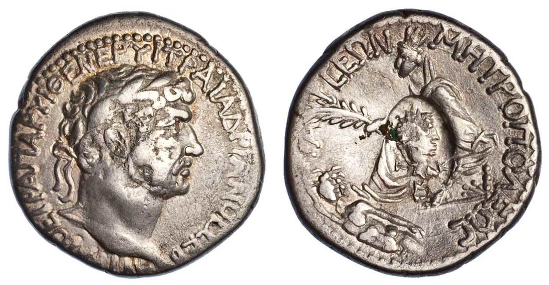 Roman Provincial. Hadrian (117-138). AR Tetradrachm of Tarsus in Cilicia. 9.08 gms. Countermarked under Caracalla, 215-217. Laureate head right, rev. MHTPONOΛEΩC TAPCEΩN, Tyche of Tarsus seated left, holding palm frond, river-god Cydnus swimming below, c/m laureate head of Caracalla right, A-M-K below within oval punch. For type: Prieur 759, for c/m: Howgego 843, Prieur 777. The letters A-M-K in the c/m are an acronym for “The First, the Greatest, Most Beautiful” – epithets granted to the city of Tarsus upon Emperor Caracalla’s arrival there in 215. Very Rare. Minute deposit on reverse. Good Very Fine.