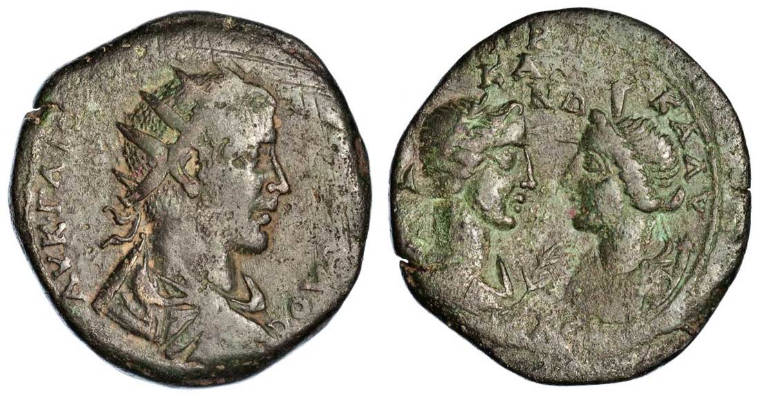Roman Provincial. Trebonianus Gallus (251-253). AE 35 of Seleucia ad Calycadnum in Cilicia. 24.72 gms. Radiate, draped and cuirassed bust right, rev. Draped buts of Apollo, set on branch, facing draped bust of Artemis-Tyche. SNG v. Aulock 5848, SNG France 1047. Deep olive sea-green over minor roughness and a few old obverse marks. Very Fine.