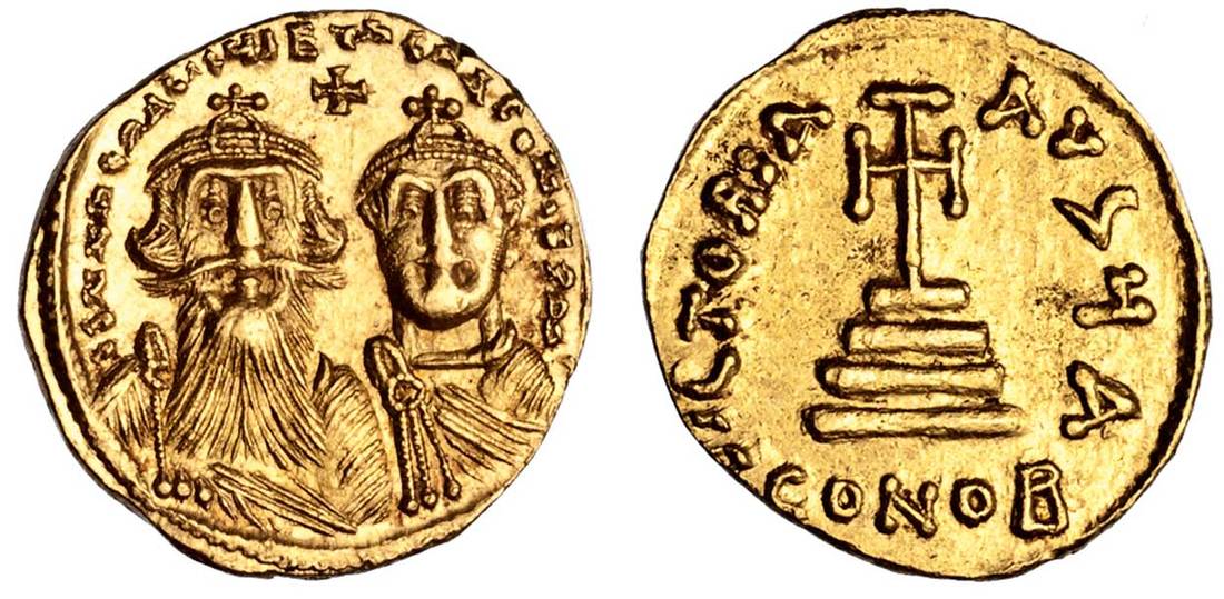 Byzantine Empire. Heraclius with Heraclius Constantine (610-641). AV Solidus, struck 629-631. Constantinople, first officina. 4.49 gms. dd NN HERACLI?S Et Hera CoNST PP A, Crowned facing busts of Heraclius and Heraclius Constantine, cross above, rev. VICTORIA AVG?A, Cross potent on three steps, CONOB in ex. DOC 26a, SB 749. Extremely Fine.