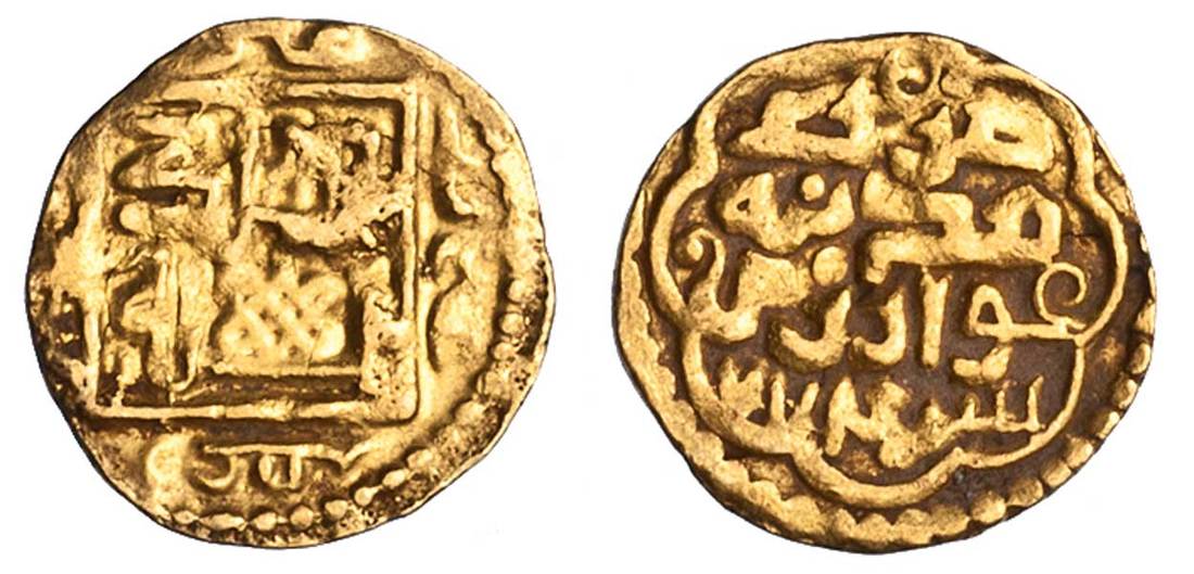 Central Asia. Sufid at Khwarizm. In the time of Husayn (AH 762-774/1361-1372 AD). Gold Fractional Dinar, Khwarizm, AH 774. 1.17 gms. Legend in square with knot, rev. Mint and date within multilobe. A-2063. Very Fine. Rare.
