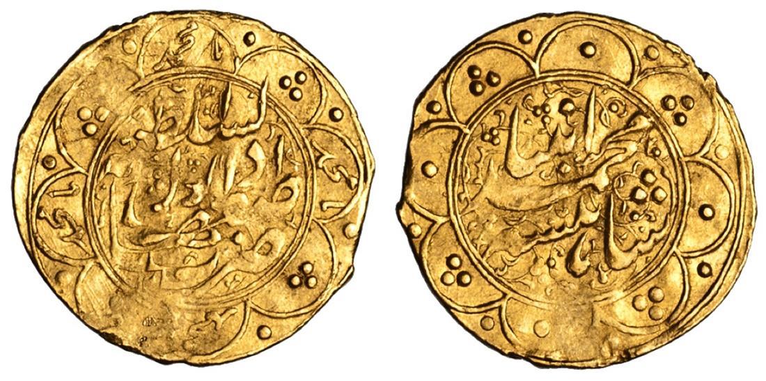 Iran. Qajar. Muhammad Shah (AH 1250-1264/1834-1848 AD). Gold Toman, Dar al-Sultanat Isfahan, nd. 3.45 gms. Ruler's name in 8-petalled circle, petals with alternating pellet and pellet triplex, rev. mint name and epithet in similar circle, "ya Muhammad" and pellet triplet alternate on petals. A-2904. Somewhat irregular edge. Good Very Fine.