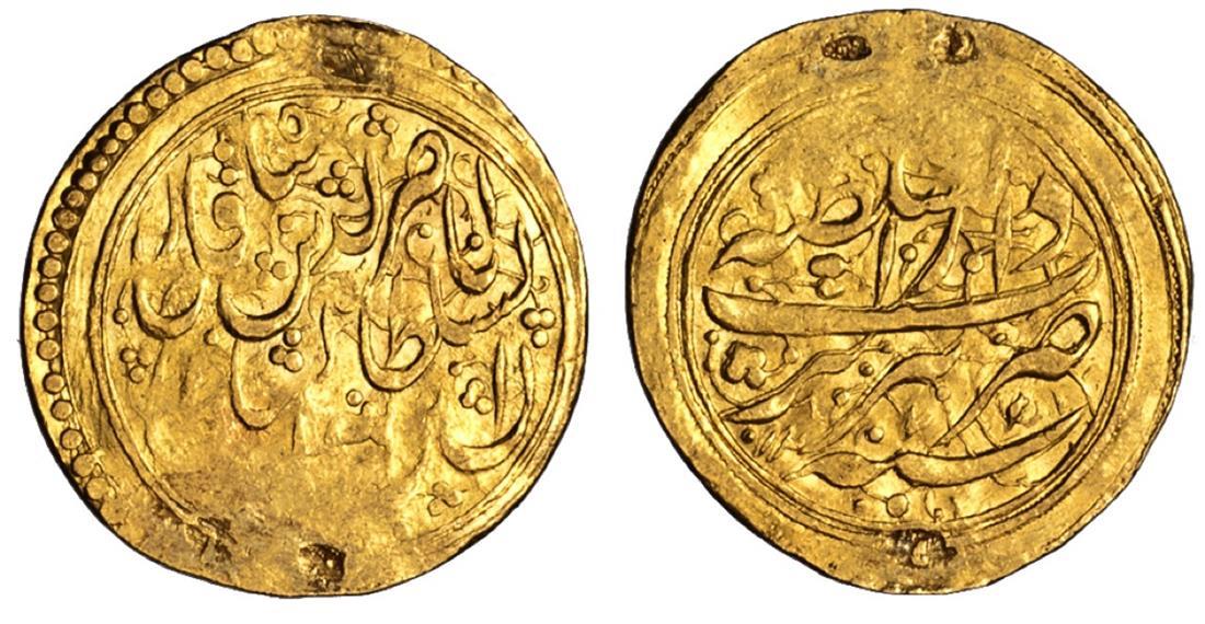 Iran. Qajar. Nasir al-Din Shah (AH 1264-1313/1848-1896 AD). Gold Toman, Dar al-Sultanat Tabriz, AH 1271. 3.23 gms. A-2921. A few shallow surface pocks, some typical weakness in peripheries. Very Fine.