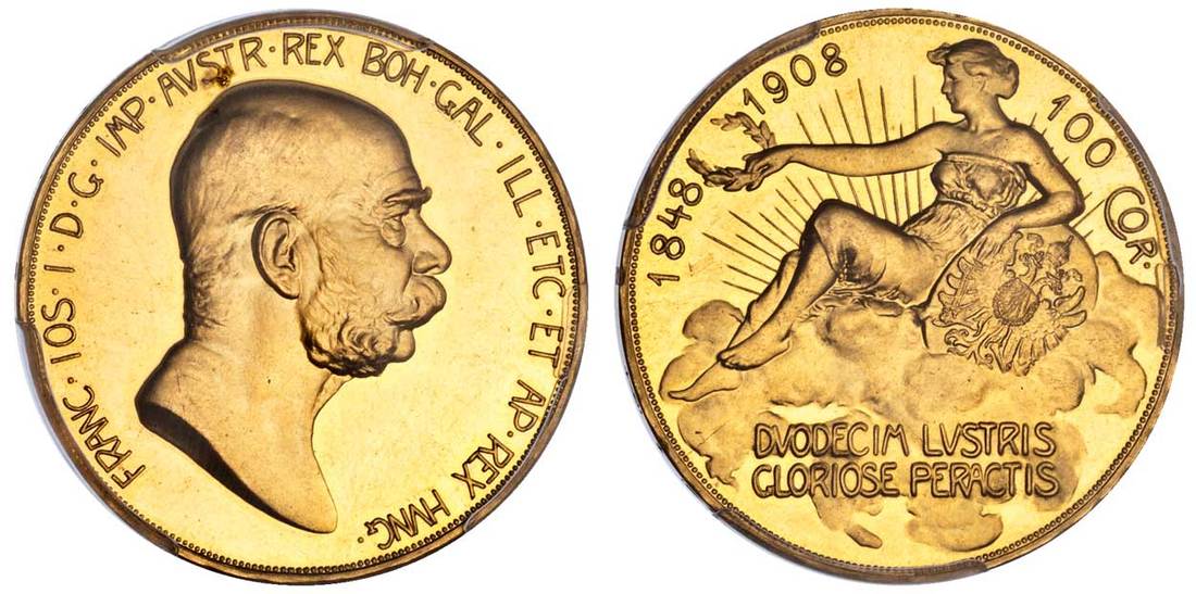 Austria. Franz Josef (1848-1916). 100 Corona, 1908. 60th Anniversary of Reign. Bare bust right of the long-reigning monarch, rev. Fame reclining left in a bed of clouds, resting one arm on the Austrian shield and holding a wreath before her, the sun's rays behind. Fr.514, KM 2812. PCGS PR 63. A very pleasing example of this rare and lovely type.
