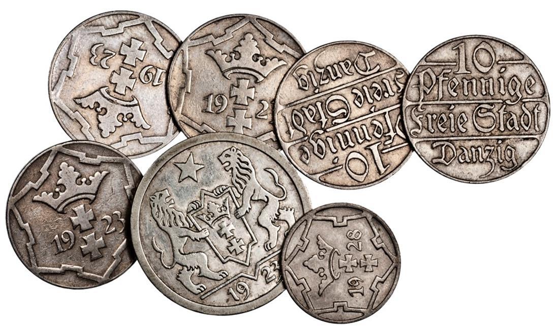 Danzig. Freiestadt. 2 Gulden, 1923. Ship and star in legend. KM 146. Very Fine; also 5 Pfennig, 1928, KM 142. EF, and 10 Pfennig, 1923 (5). KM 143. VF. (7)