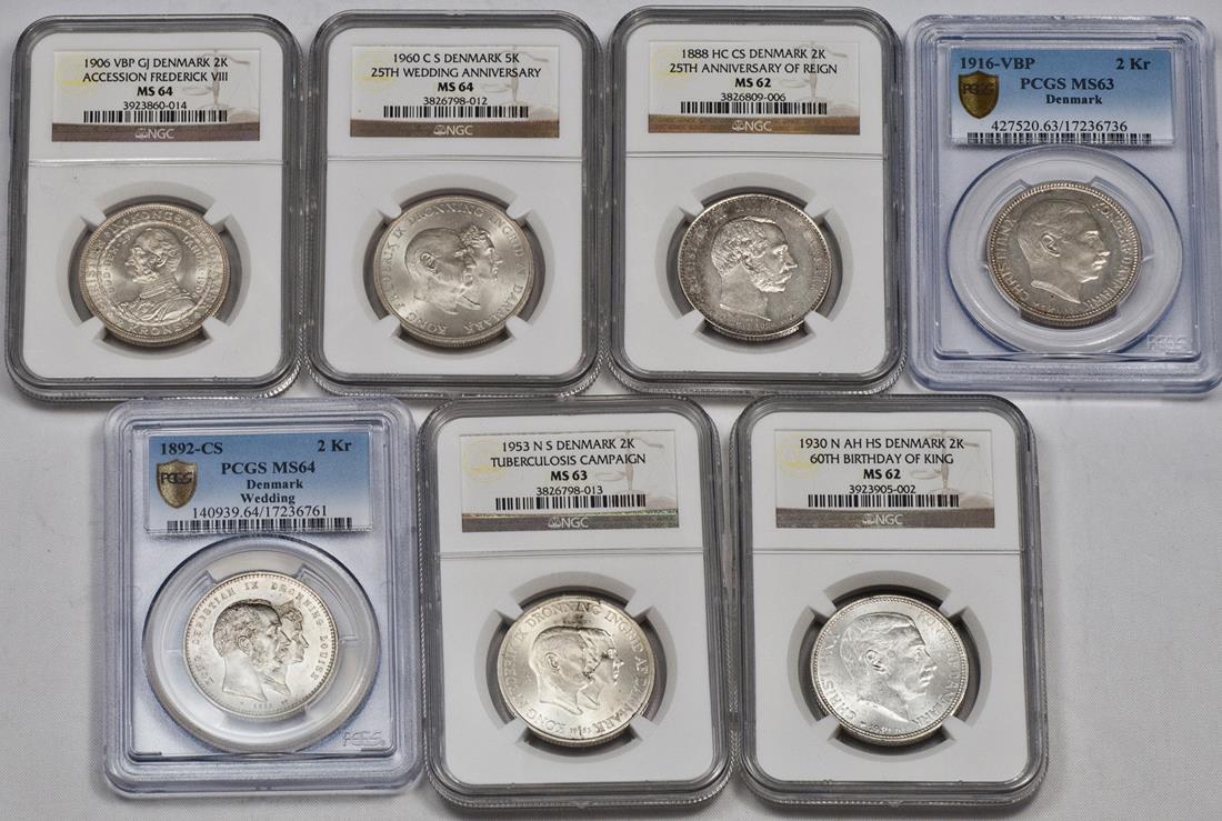 Denmark. Christian IX-Frederik IX. Sextet of Commemorative issues. 2 Kroner: 1888 - 25th Anniversary of reign. NGC MS 62, 1892 -Golden Wedding Anniversary. PCGS MS 64, 1906 - Death of Christian IX. NGC MS 64, 1930 - King's 60th Birthday. NGC MS 62, 1953 - TB Campaign in Greenland. NGC MS 63; 5 Kroner: 1960 -Silver Wedding Anniversary. NGC MS 64; and regular issue 2 Kroner, 1916. NGC MS 63. KM 799, 800, 803, 829, 844, 852, 820. (7)