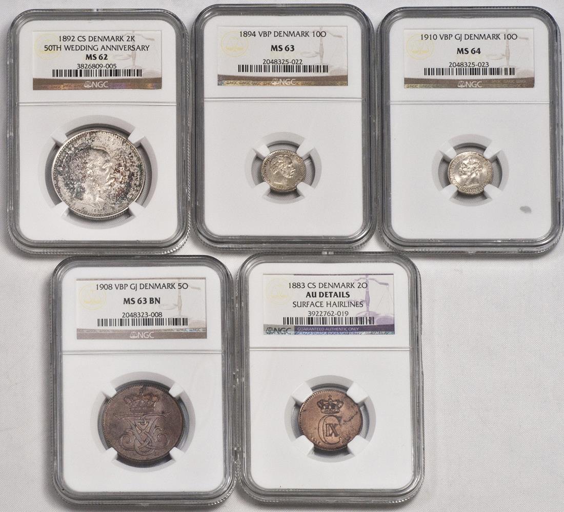 Denmark. Christian IX-Frederik VIII. Quintet of high-grade silver and AE issues: 2 Kroner, 1892 - Golden Wedding Anniversary. NGC MS 62, 10 Øre, 1894. NGC MS 63, 10 Øre, 1910. NGC MS 64, 5 Øre, 1908. NGC MS 63 BN, and 2 Öre, 1883. NGC AU Details - surface hairlines. KM 800, 795.2, 807, 806, 793.1. (5)