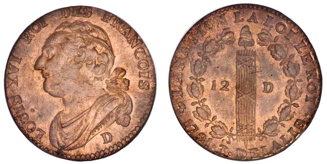 France. Constituency. 12 Deniers, 1791 D. Draped bust of the ill-fated Louis XVI left, rev. Fasces, 12-D, within wreath. KM 600.5. PCGS MS 65 RB. A bold, superb example with much mint red.