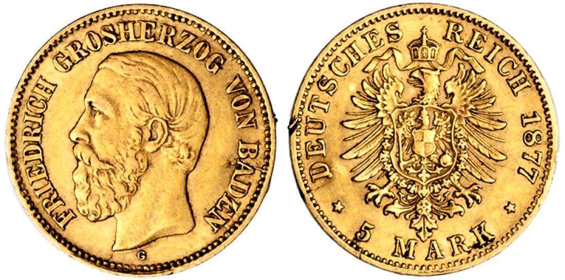 German States. Baden. Friedrich (1852-1907). Gold 5 Mark, 1877 G. Head left, rev. Crowned Imperial eagle. Fr.3759, KM 266. Small edge cut reverse. Very Fine.