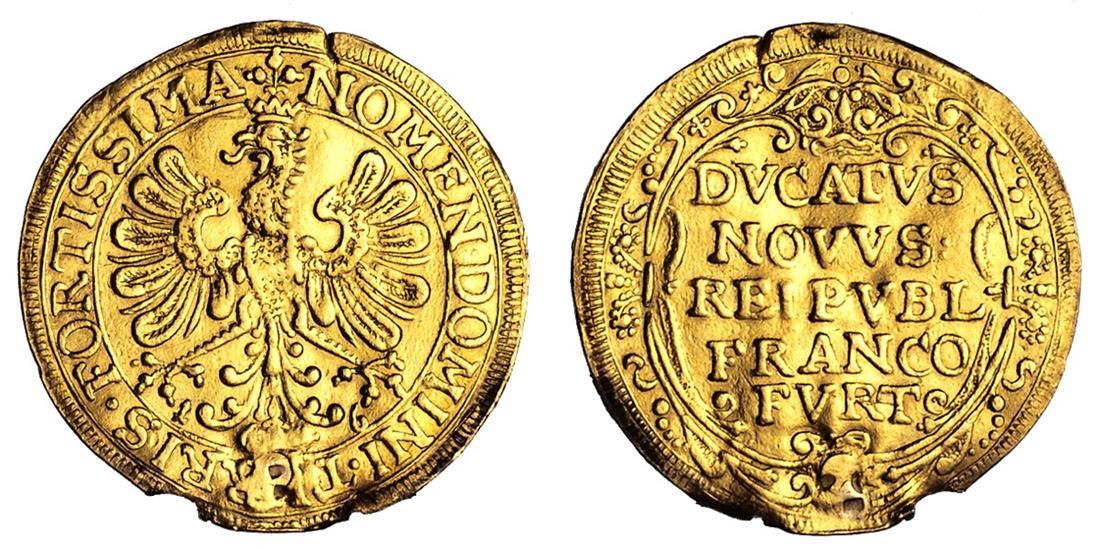 German States. Frankfurt. Freie Reichstadt. Ducat, 1646. Franconian eagle within inner circle, rev. Five-line legend within cartouche. Fr.976, KM 97.1. Once lightly polished, edge chip at 6:30 possible from old mount. Extremely Fine.