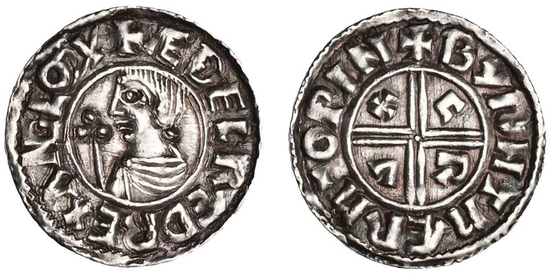 England. Late Anglo-Saxon. Aethelred II (978-106). Crux-type Penny. Winchester, moneyer: Beorhtmer. 1.70 gms. Draped bust left, holding scepter, + AEDELRED REX ANGLOx, rev. Voided short cross, C-R-V-X in angles, all within central circle, +BYRHTMAER M-O PIN. S.1148. Pearly slate-gray. Good Very fine.