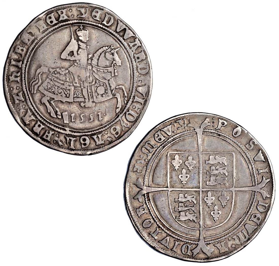 England. House of Tudor. Edward VI (1547-1553). Fine Silver issue. Crown, 1551, mm: y. 30.34 gms. King astride war horse right, date below, rev. Shield on cross. S.2478. A few minor obverse hairlines. Old toning. Good Fine.