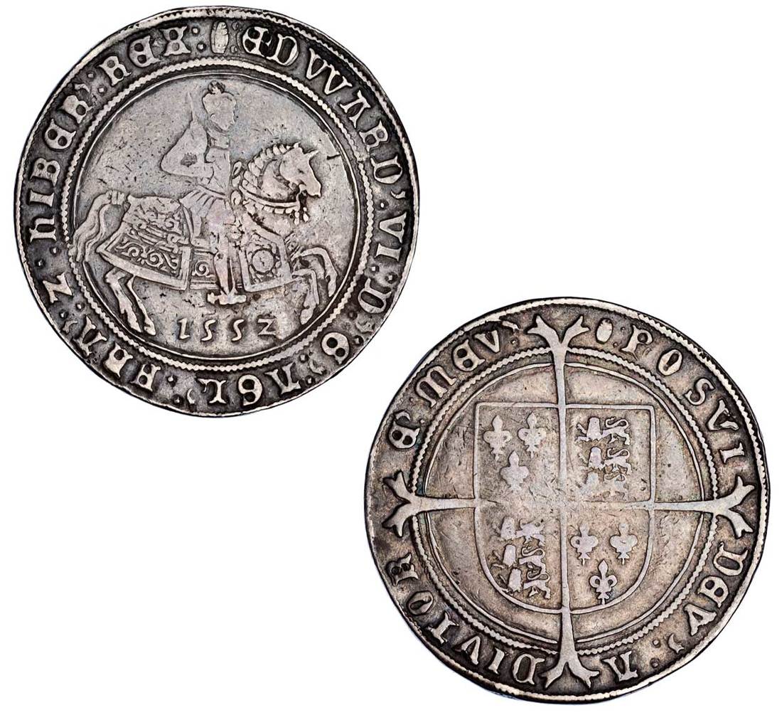England. House of Tudor. Edward VI (1547-1553). Fine Silver issue. Crown, 1552, mm: tun. 30.89 gms. King astride war horse right, date below, rev. Shield on cross. S.2478. Some weakness of strike reverse center. Rich medium gray with light iridescent hues. Good Fine.
