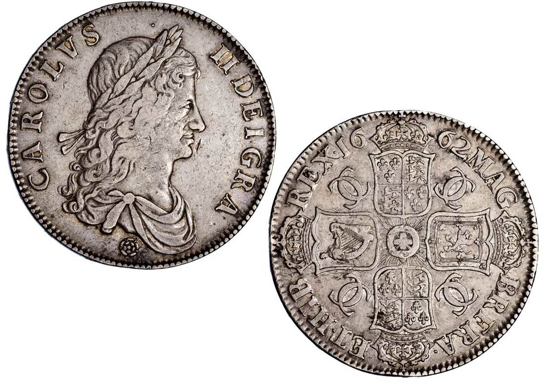 England. Charles II (1660-1685). Crown, 1662. Edge: DECVS ET TVTAMEN *. First draped bust right, rose below, rev. Crowned cruciform Arms, interlinked CC monograms in angles. S.3351. Small nick before face. Light slate gray. About Very Fine/Good Very Fine.