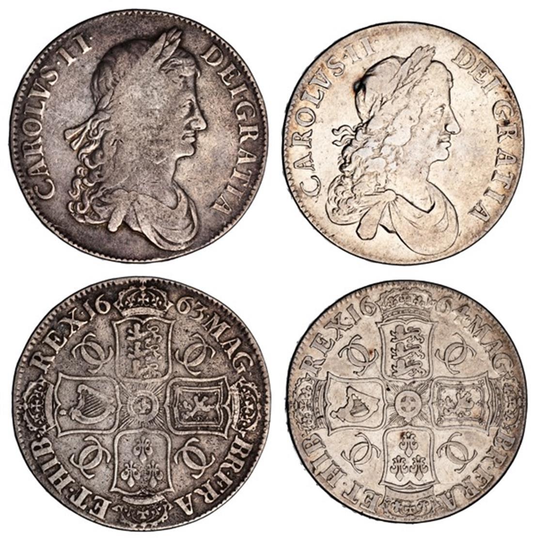 England. Charles II (1660-1685). Pair of Crowns, 1663, 1664. Laureate, draped first; second bust right, revs. Crowned, cruciform Arms, interlocked CC monogram in angles. The first toned Very Good-Fine with obverse hairline, the latter bright from old cleaning, Fine. S.3354, 3355. (2)