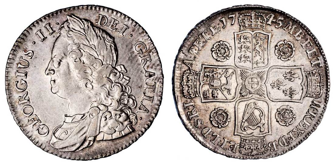 Great Britain. George II (1727-1760). Halfcrown, 1745. Laureate, draped and cuirassed bust left, rev. Crowned, cruciform Arms, roses in angles. S.3694, KM 584.3. Slight weakness obverse center. About Extremely Fine.
