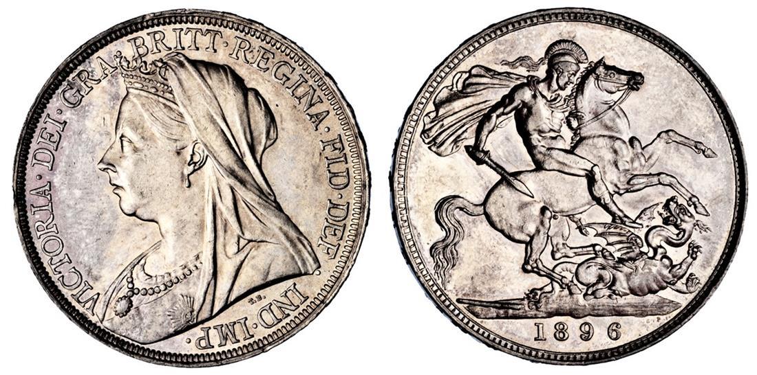 Great Britain. Victoria (1837-1901). Crown, 1896. LX. Old, veiled bust left, rev. St. George. S.3937, KM 783. Light bagmarks, decent lustre. AU-Uncirculated.