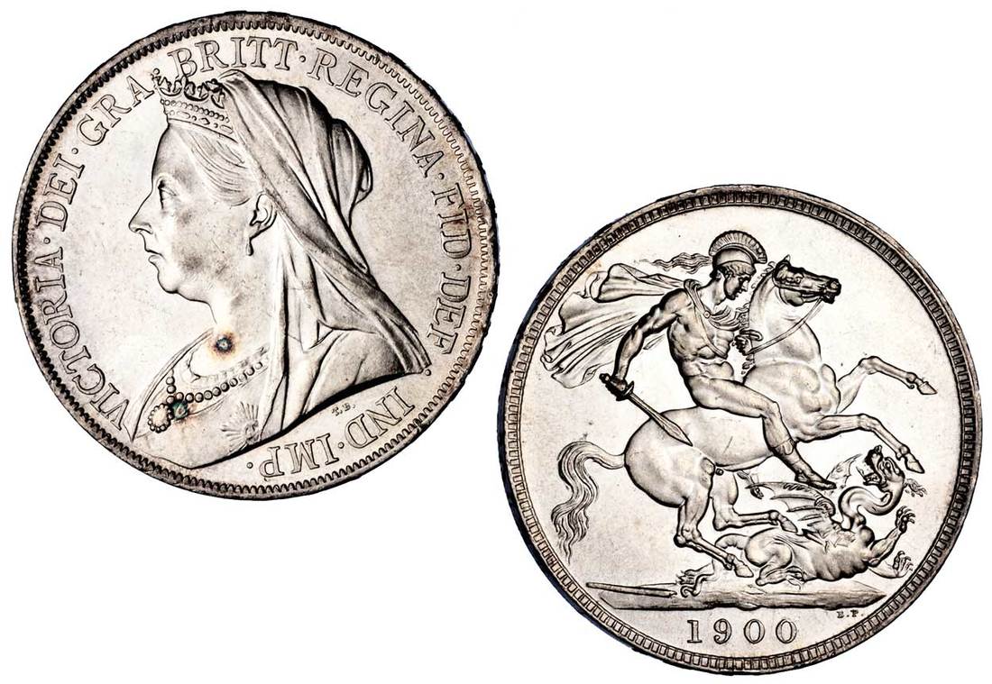 Great Britain. Victoria (1837-1901). Crown, 1900. LXIV. Old, veiled bust left, rev. St. George. S.3937, KM 783. Two obverse toning spots. Frosty. Brilliant Uncirculated.