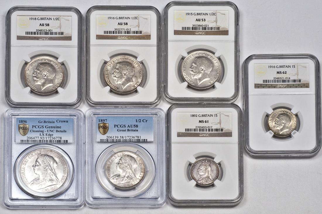 Great Britain. Victoria-George V. Septet of Silver issues. Crown, 1896 LX. PCGS Genuine Cleaning UNC Details, Halfcrown, 1897. PCGS AU 58, Halfcrowns, 1915, 1916, 1918. NGC AU 53, AU 58, AU 58; Shillings, 1892, 1916. NGC MS 61, MS 62. (7)