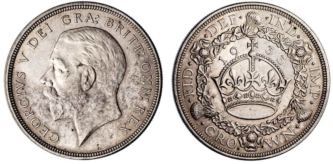 Great Britain. George V (1910-1936). Crown, 1933. Bare head left, rev. Large crown within ornate wreath. S.4036, KM 836. Russet hues. About Uncirculated.