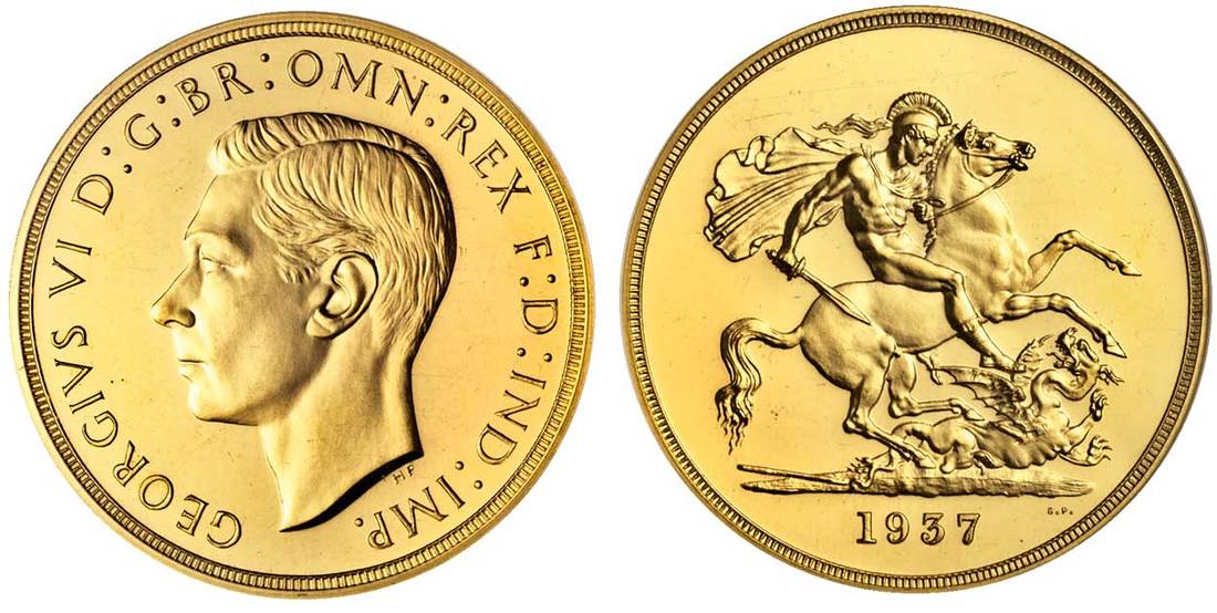Great Britain. George VI (1936-1952). Five Pounds, 1937. Bare head left, rev. St. George. S.4074, KM 861. 5,001 minted. NGC PF 63.