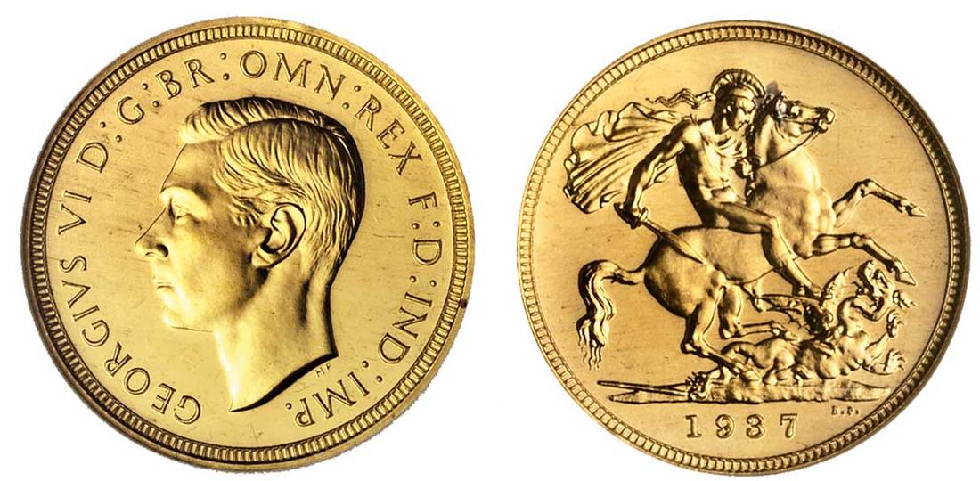 Great Britain. George VI (1936-1952). Sovereign, 1937. Bare head left, rev. St. George. S.4076, KM 859. 5,001 minted. NGC PF 63.