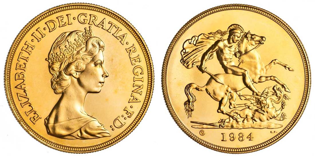 Great Britain. Elizabeth II (1952-). Five Pounds, 1984. Crowned young bust left by Machin, rev. St. George, U in circle left of date. S.4202, KM 924. 15,104 pieces minted. Brilliant Proof.
