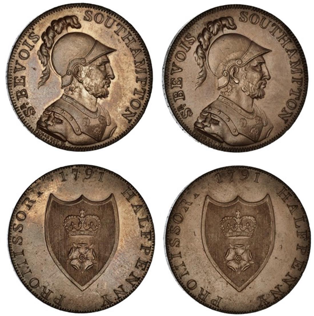 Great Britain. Hampshire. Portsmouth / Southampton. Pair of 1791 Halfpenny Tokens. Helmeted bust of Sir Bevois right, rev. Arms - crowned rose. Edge: PAYABLE AT THE OFFICE OF W. TAYLOR R.V. MOODY & CO. D&H 89. W. Taylor was a maker of rope blocks for ships and gun carriages. His mill was located about four miles from Southampton in South Stoneham. One with some hairlines. Both Bronzed and with prooflike surfaces. Uncirculated. (2)
