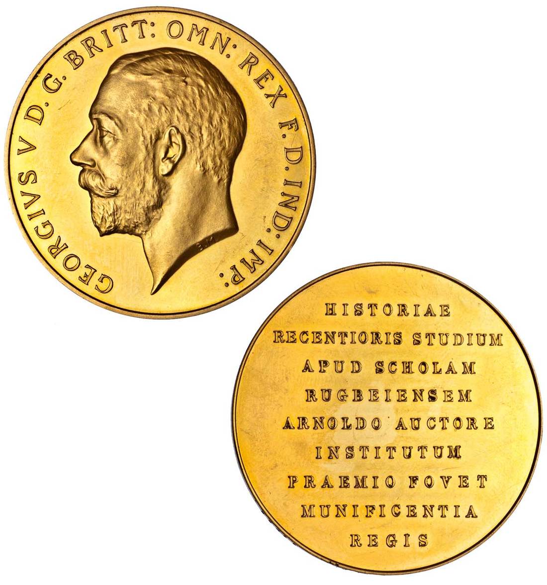 Great Britain. George V (1910-1936). Rugby School Gold Prize Medal, 1911. 44.5mm. 54.91 gms. George V head left, rev. HISTORIAE RECENTIORIS STUDIUM APUD SCHOLAM RUGBEIENSEM ARNOLDO AUCTORE INSTITUTUM PRAEMIO FOVET MUNIFICENTIA REGIS in nine lines. Awarded to: F.J. BECHMANN 1911 on edge. The Rugby School in Warwickshire is one of the oldest independent schools in Britain and one of the most prestigious. Some typical hairlines. Brilliant Uncirculated.