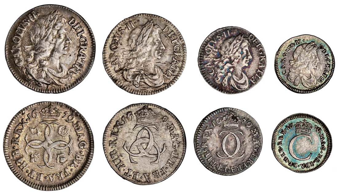 England. Charles II (1660-1685). Maundy Set, 1679. Penny, 2, 3 and 4 Pence. Laureate, draped bust right, rev. Mark of value indicated by number of C monograms crowned, rose, thistle, fleur and harp in angles of the Groat. S.3392. Faint haymarking on the Threepence. Attractive old toning. Good Very Fine-Extremely Fine. (Set of 4)