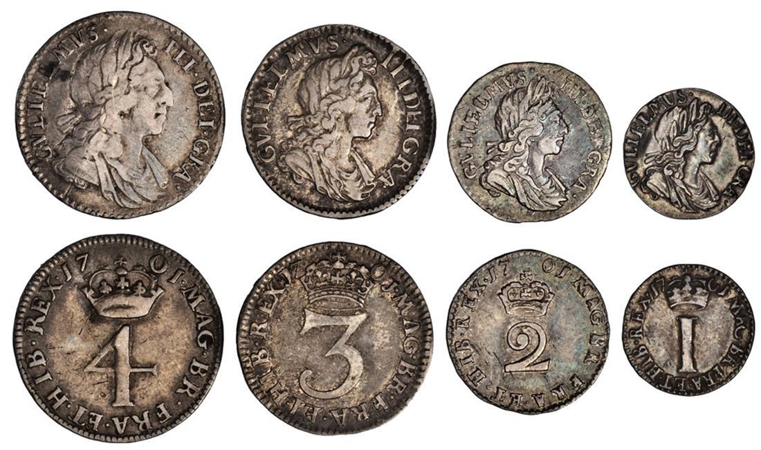 England. William III (1694-1702). Maundy Set, 1701. Penny, 2, 3 and 4 Pence. Laureate, draped bust right, rev. Crowned numeral value. S.3553. Toned. Very Fine. (Set of 4)
