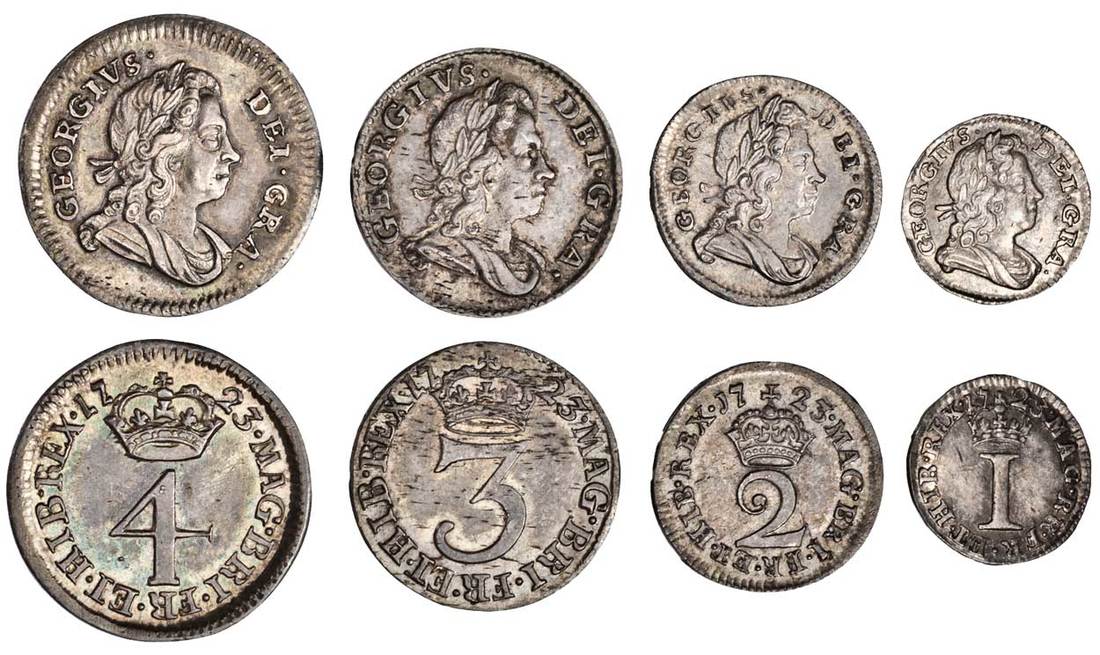 Great Britain. George I (1714-1727). Maundy Set, 1723. Penny, 2, 3 and 4 Pence. Laureate, draped and cuirassed bust right, rev. Crowned numeral value. S.3658. The Threepence faint haymarking. Toned with attractive lustre. Extremely Fine-About Uncirculated. (Set of 4)