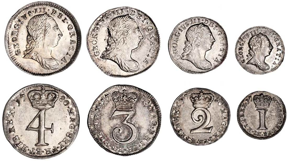 Great Britain. George III (1760-1820). Maundy Set, 1780. Penny, 2, 3 and 4 Pence. Laureate, draped and cuirassed bust right, rev. Crowned numeral value. S.3762. Lightly toned with soft iridescent hues, good lustre. Choice Uncirculated. (Set of 4)