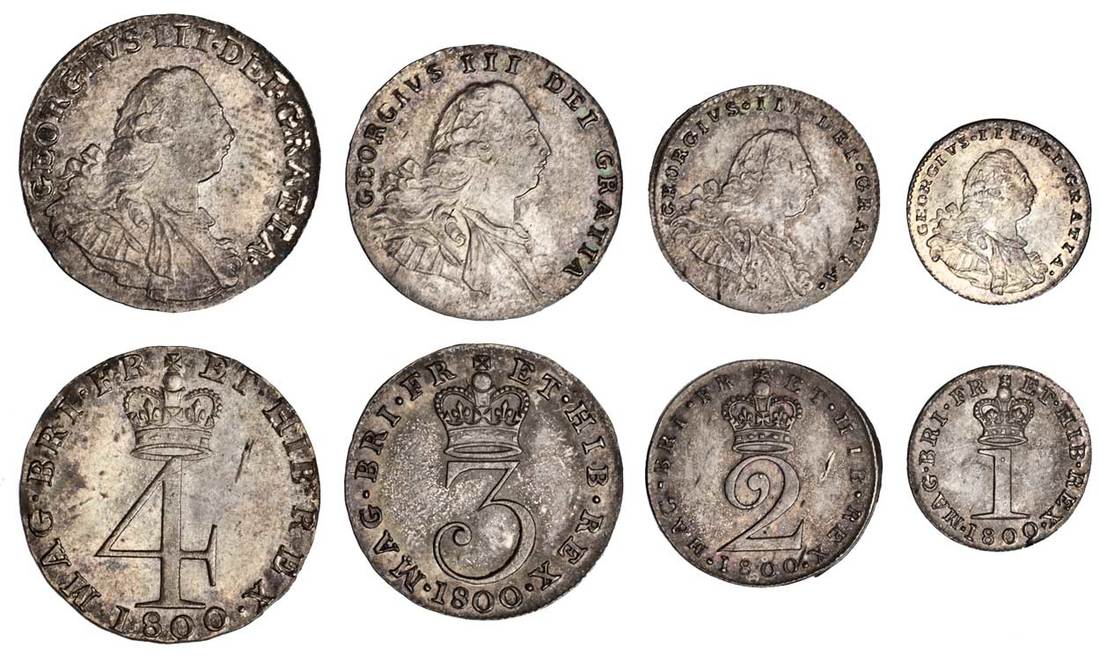 Great Britain. George III (1760-1820). Maundy Set, 1800. Penny, 2, 3 and 4 Pence. Older laureate, draped and armored bust right, rev. Crowned "normal" numeral value. S.3764. Light violet-gray with attractive iridescent hues. Choice Lustrous Uncirculated. ex Springfield Collection, Bower and Ruddy, Dev. 15-18. 1981, lot 1880. (Set of 4)